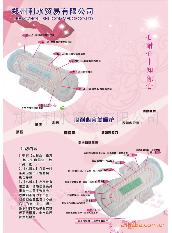 此产品是09年本公司的新品,其质量更胜一筹,材料采用高档高分子木浆,舒适感更强,防侧漏功能更好,吸收率加大,渗透性能好等诸多优点。包装美观。是众多白领一族的一致选择。