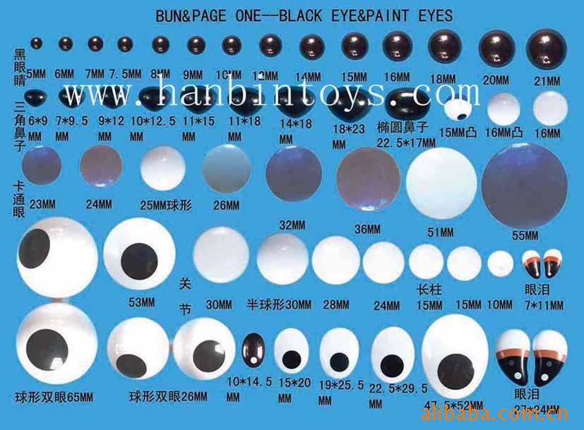 眼睛系列产品有:水晶眼、转动眼、黑眼睛及各式印刷眼等;