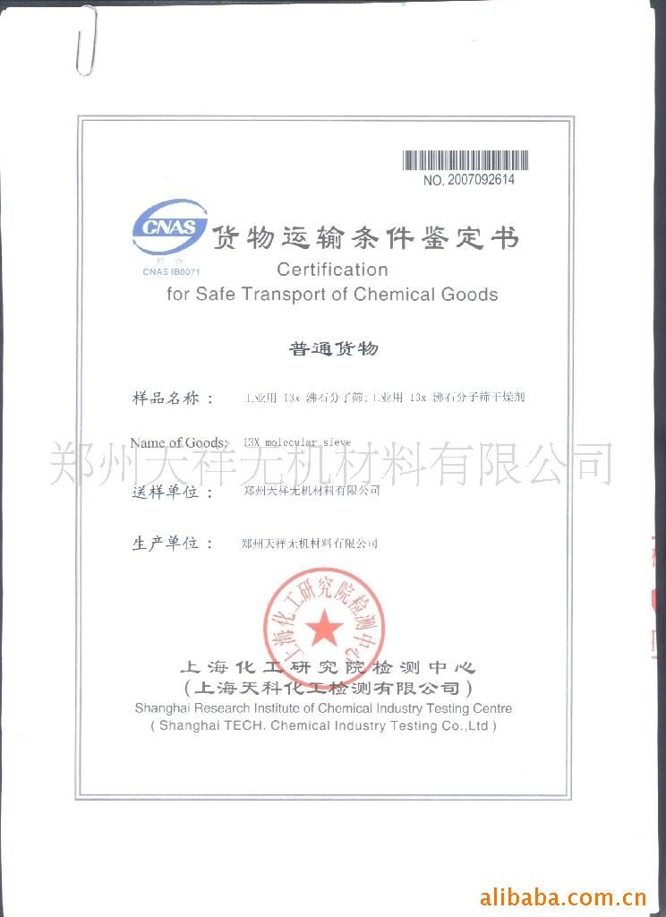 (5)13X空气分离专用分子筛是为满足深冷空分行业的特殊要求,进一步提高分子筛对空气中氧化碳、乙炔和水的吸附能力,避免空分过程中出现冻塔现象而生产的专用分子筛,本产品适用于各种大小深冷空气分离装置。