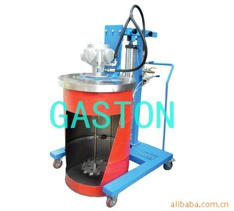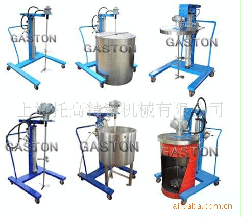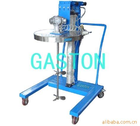 此机型以坚固U型槽钢构成,适用于任何流体槽、桶类,装有四个万象轮,使搅拌机可以轻便移动。其中一组附有刹车,使搅拌机搅拌时安稳固定,并以气缸控制升降高度,升高后离地1050mm。无段式速度调整.气动马达可配减速机,扭力更大,适用于涂料,树脂,水性胶水,化学原料,化装品原料,食品等搅拌.