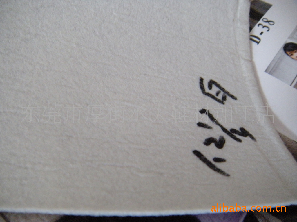 1.2m白色仿里皮不织布正面细节图,可以看清楚仿里皮的材质,主要用作鞋里布、鞋垫、灯饰底座垫片、电子产品垫片等方面。不织布厚度细节图,可依客户要求订做不同厚度及颜色的不织布,因价格波动比较厉害,如有需要,请及时询价,谢谢。仿里皮不织布局部细节图,也可用于与真皮粘贴的主要用料,可代客户背胶、分切及冲型。