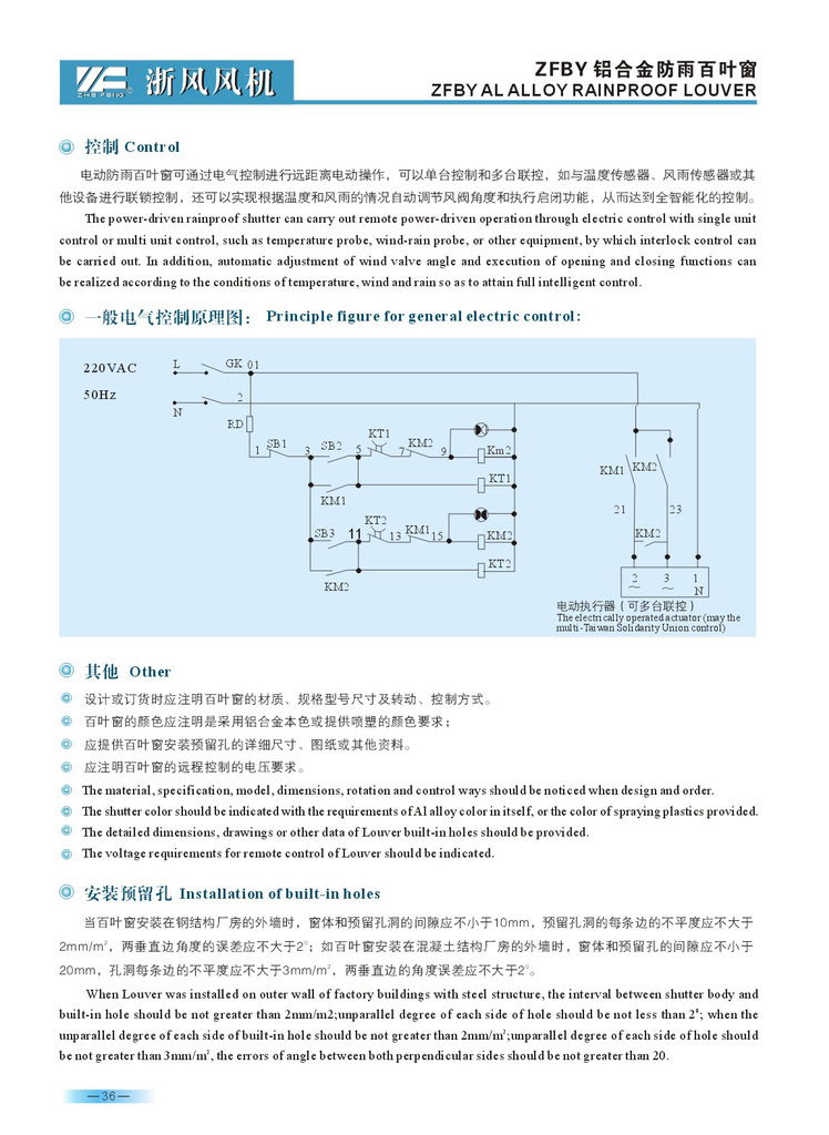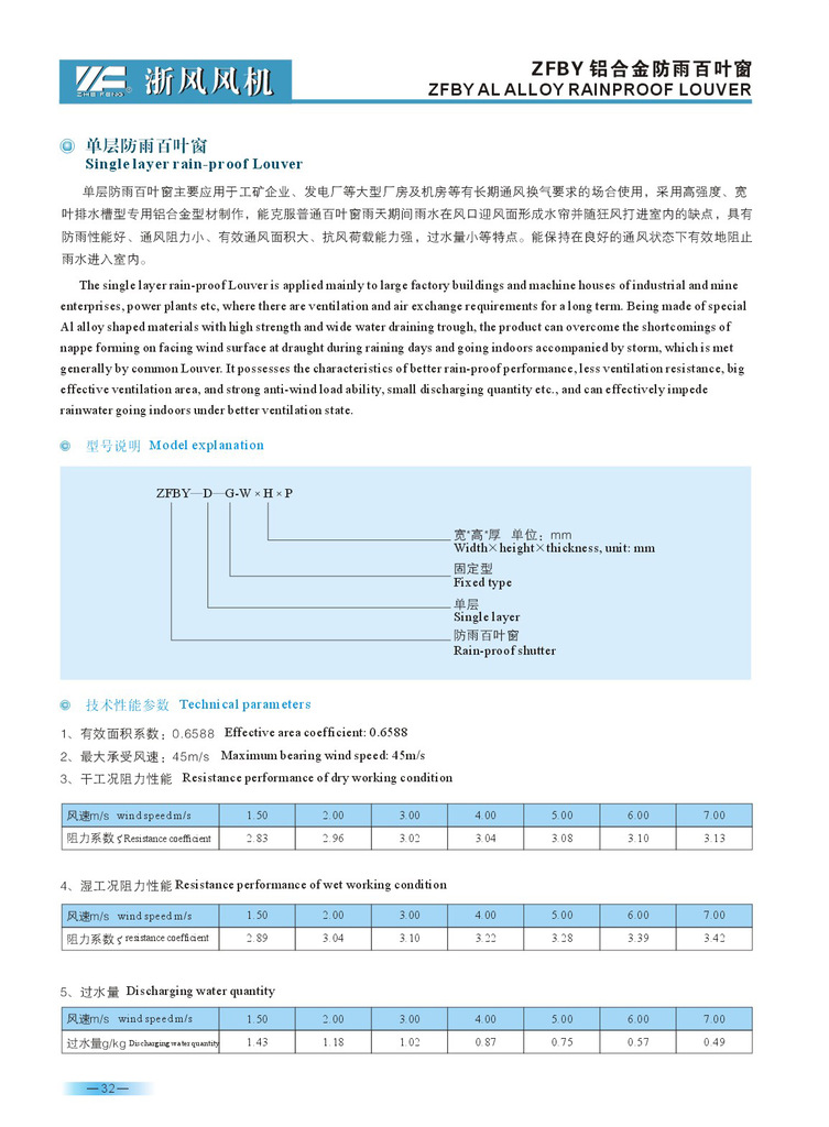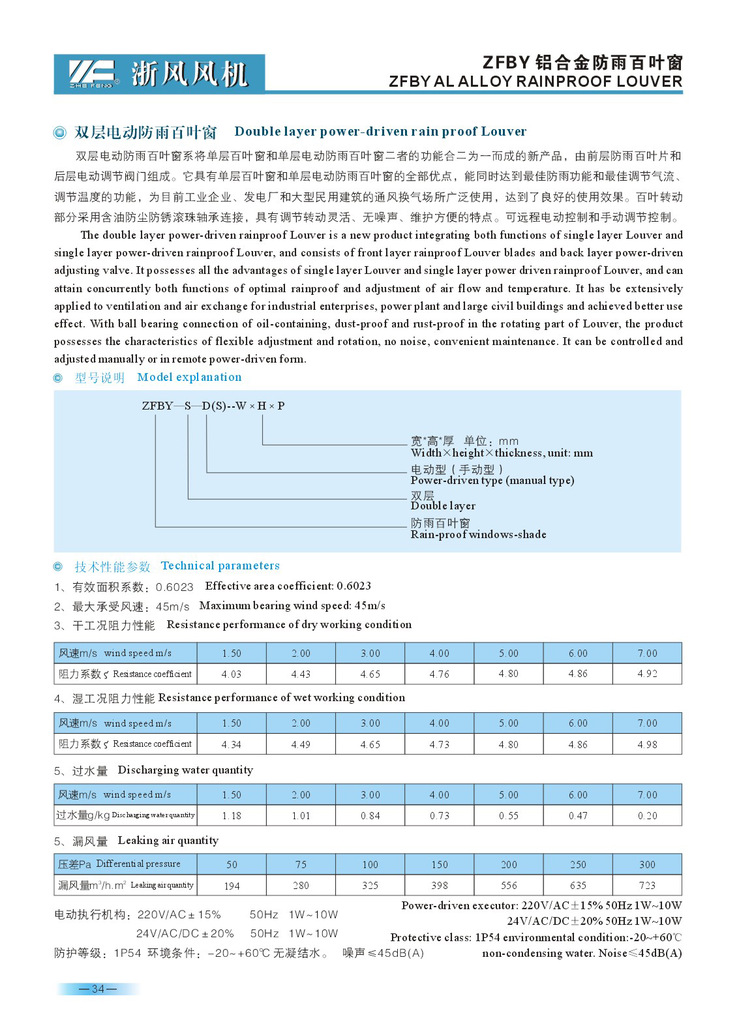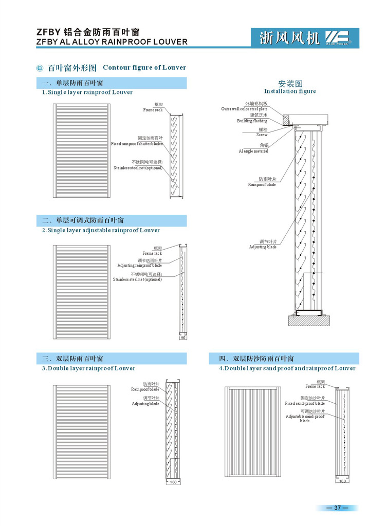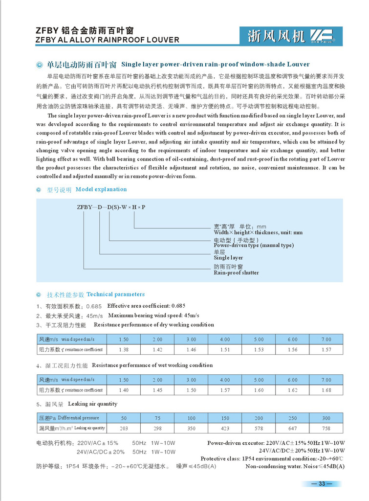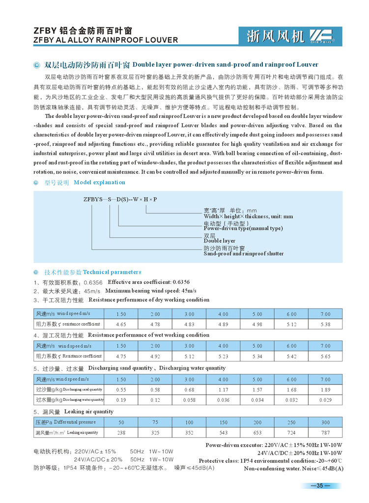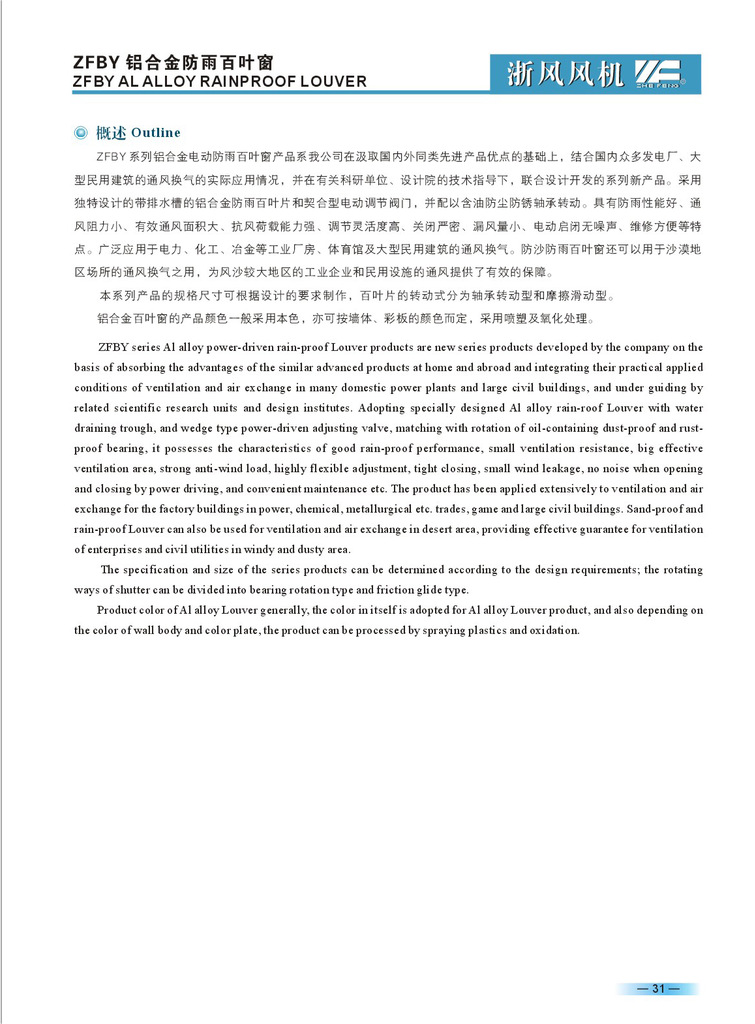 我公司系专业生产防雨、防尘、防沙百叶窗的企业,产品已应用于国电泰州电厂、江苏谏壁电厂、江西黄金埠等大型火力发电厂工程,产品质优价廉,欢迎垂询。详见企业网站:www.zhefeng.net,已获得国家专利证书。ZFBY系列电动防雨百叶窗系我公司在汲取国外同类先进产品优良性能特点的基础上,并结合国内众多发电厂、大型民用建筑通风换气系统的防雨百叶窗的实际使用情况,针对国内同类产品传动系统转动力矩小,磨擦阻力大,运转若干时间后传动系统易卡死、设备维修不易的产品技术现状,在浙江大学的技术合作下,联合设计开发的新产品。并通过上海东华大学环境科学与工程学院的性能测试,完全达到了设计的技术要求。是目前在国内率先在防雨百叶窗产品转动系统中采用滚珠轴承传动替代滑动轴承传动的企业,产品获得国家知识产权局的国家专利。产品具有有效通风面积大、通风阻力小、防雨性能好、转动阻力小、运转力矩大、使用方便寿命长、维修方便等等特点。