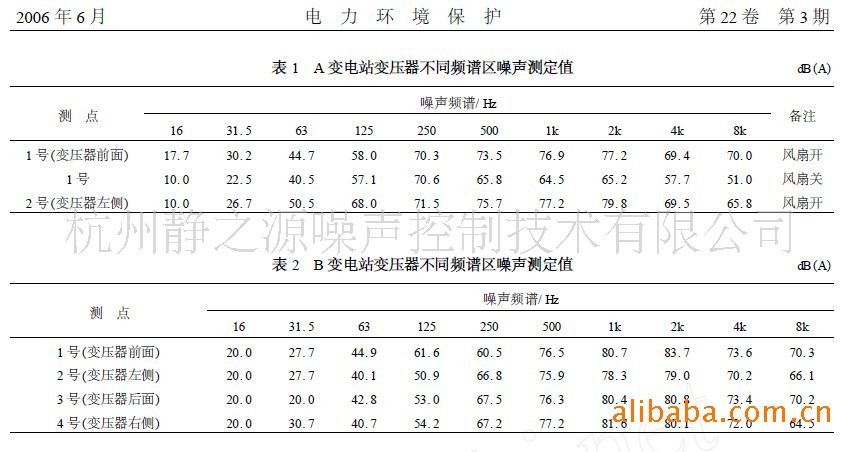 A、B 变电站变压器不同频谱区噪声测试结果见表1、表2。
