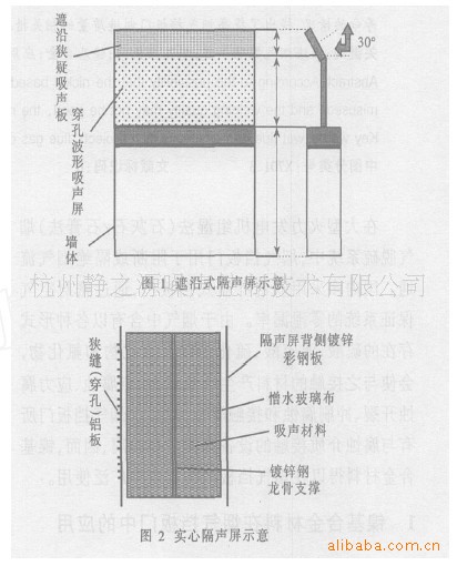 对露天变压器,根据周围环境噪声水平和周围敏感点的分布情况,可采用“ —”、“L”、“[ ”形隔声屏。根据频谱特性、噪声水平和敏感点位置计算隔声墙屏高度、长度、厚度、隔声屏结构,选择适当的吸声材料。隔声屏内层具有噪声透射功能,外层隔声选用隔声性能好的材料,两层之间设骨架和吸声材料。隔声屏可采用底部墙体,上部吸声、隔声的隔声墙,也可全部采用具有吸声、隔声作用的隔声屏,隔声装置结构见图1、图2。