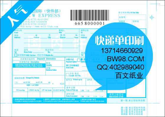 ★运单的生产印刷壹式两联至八联的联单,纸质优好,电脑孔位套打标准。产品具有电脑连续打印,无碳复写,多联套打等功能,为满足广大客户的需求,我公司提供多种规格的票据印刷,提供条码防水技术。包括普通的联式快递单,不带背胶的联式快递单,非抽取式快递联单,可电脑扫描的条形码快递单(39码/128码/35码/35交叉码/二维条码等),流水号快递单,不可电脑扫描的条形码快递单和单据、票据,联单、表格。快递单、详情单、货运单据、物流票据适用于快递、物流、货运代理公司。欢迎来电咨询,网上咨询,本公司竭诚为您服务!!!
