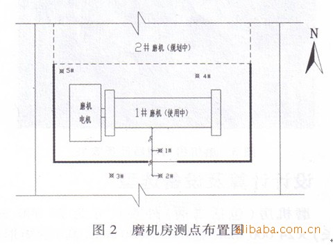 在对磨机房进行治理之前,首先对磨机房的主要设备-水泥磨机以及磨机房周围几个关键点进行了噪声强度和频谱特性测试,测试结果见表1,测点布置图件图2。