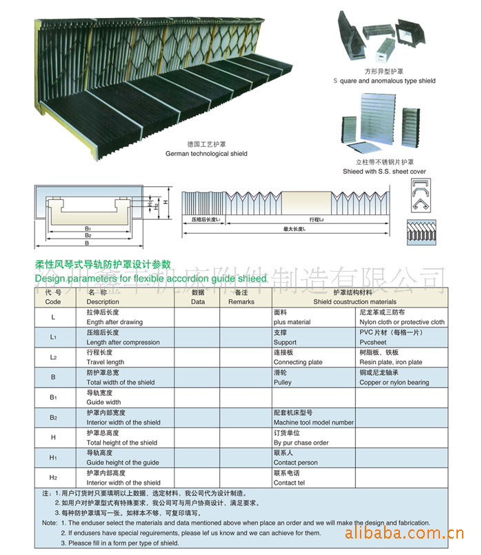 按防护方向的不同,防护罩分为水平防护罩和垂直防护罩。钢制导轨防护罩一般用1Cr13材质制成能防止锈蚀。防护罩有多节钢板重叠在一起组成,每节后侧均有一块立板,立板上镶有滑块或滚轮,可在导轨上滑动,防护罩可随之伸长或压缩。