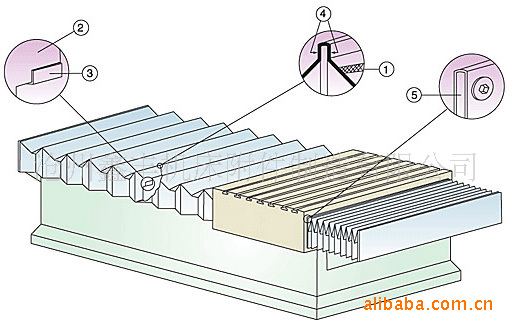 钢板防护罩是由2 -3mm厚钢板或不锈钢板冷压成形而成的。可以为所有的机床种类提供相应的导轨防护类型(水平、垂直、倾斜、横向)。根据运行速度及导轨的不同钢板防护罩结构也不同。运行速度10m /min之下的我们装有聚安脂或黄铜滑块。中等速度30m /min之下的装有滚轴。驱动板、刮屑板及吸屑板之间还需要用缓冲系统,目的是减少碰撞、噪音及摩擦。钢板防护罩的节数对其比例、重量及运行特性都很重要。每个单节都应尽可能的长,这样可以减少节数,一般情况最大拉伸与最小压缩比例应在3:1和5:1之间(最高可达10:1)。宽度较大时必须折边,提高横向稳定性。屋脊型及折边都可以做到,倾斜型可以使液体及碎屑自动流走。