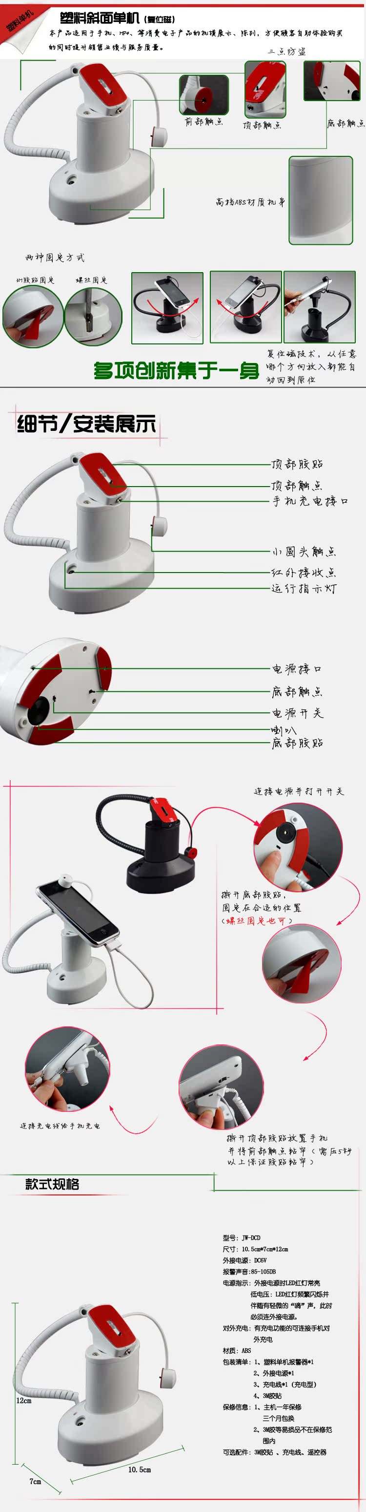 本品为我司自主研发的商品真机陈列报警器美观大方实用,保障安全的同时不失时尚。JW-F-42---JW-F-49型标准功能全陈列架,架子内部具有报警功能,用遥控器开关系统,有后备可充电锂电池,可选择外接DC-6V外部电源供电,可选择倾斜式陈列座或水平式陈列座架。可以用于各类手机,照相机,MP4等各类消费类电子产品真机的安全展示,使陈列更简单,顾客选购产品更方便。适用于手机大卖场、电信移动联通营业厅、电子数码城、数码相机专柜、GPS专柜、MP4专柜、家电大卖场、超市及各类中小型电子数码产品展览会场。(有黑/白两种颜色可选)