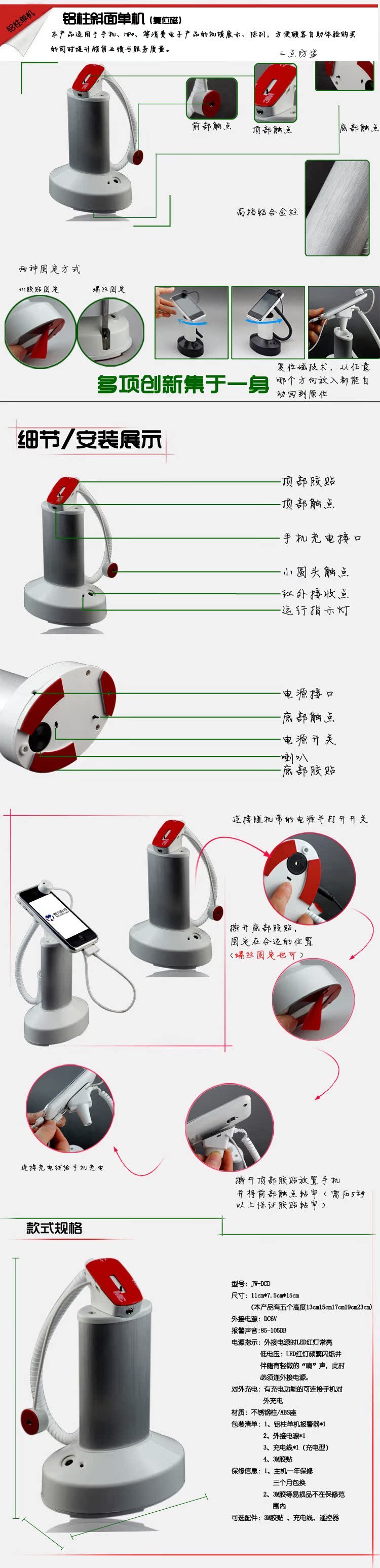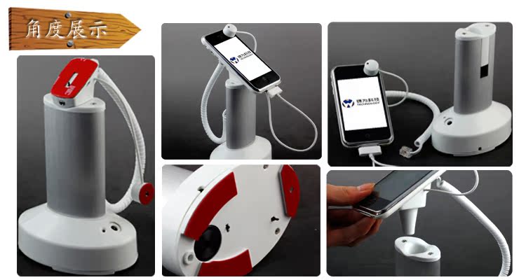 手机、数码相机、MP3、MP4、GPS等数码电子产品实际陈列于本品上,本产品由报警主机、报警探头、3M胶等组成。报警主机安装于展示架或陈列柜上,报警探头则粘附于展示产品上。顾客可以方便的从架子上取下陈列品,自由的对陈列品的功能和外观进行操作和感受,如果顾客想将陈列品拿走,报警器会立即发出持续的报警声,报警声将持续到管理人员来做复位处理为止。