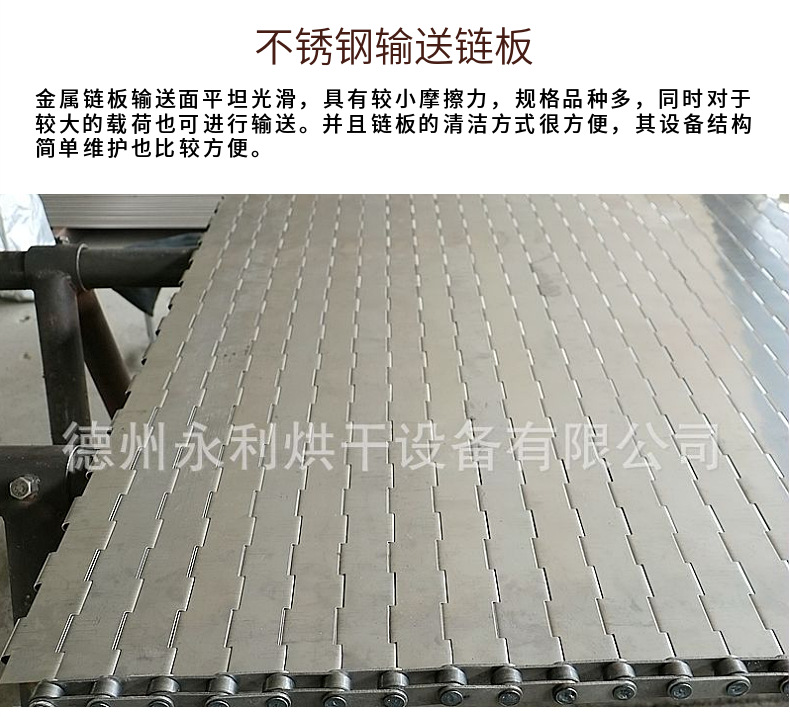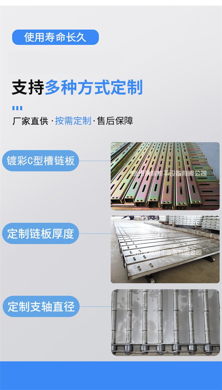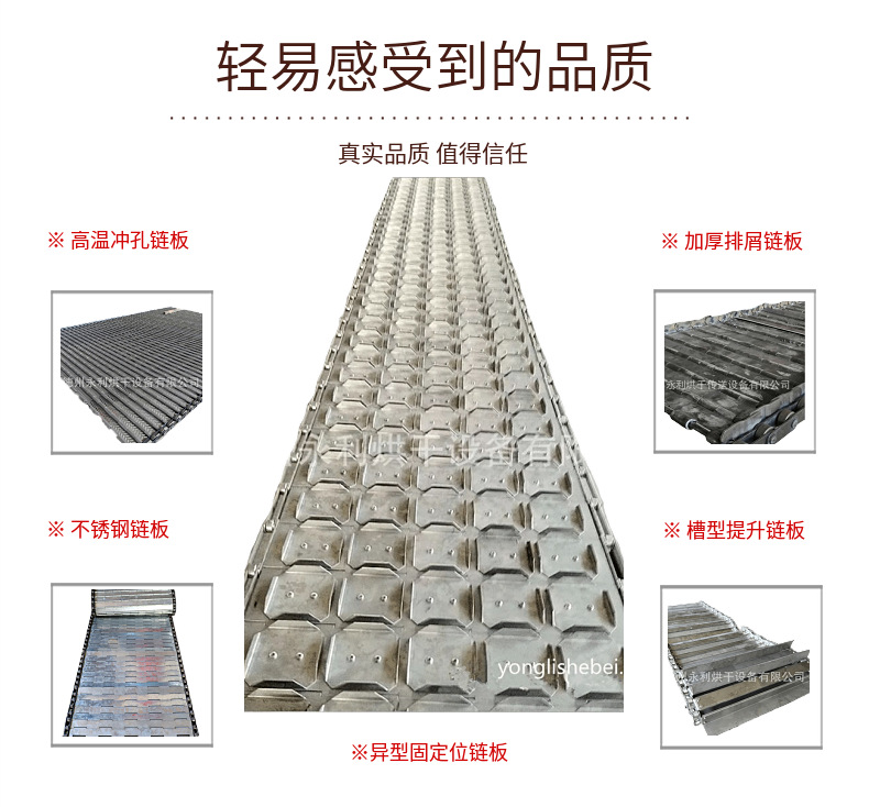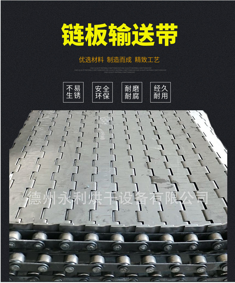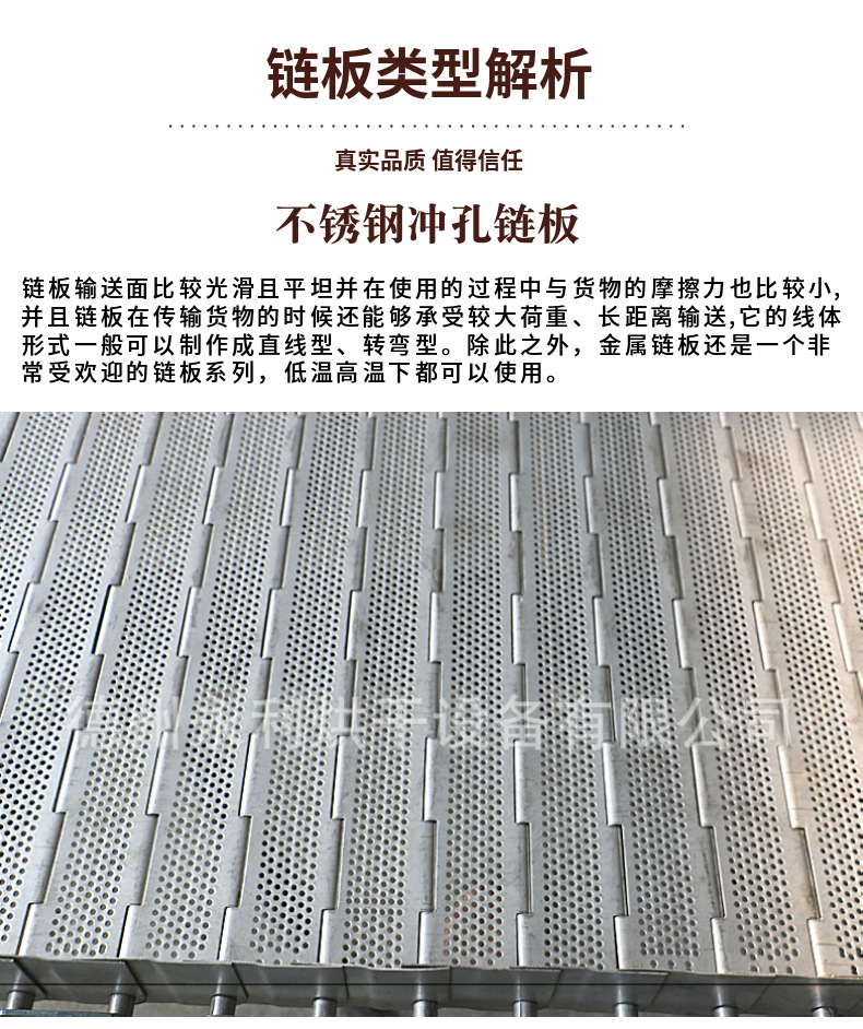 重型链板输送带通过加厚链板、加粗支杆及链条节距来增加承重量,链板输送带加提升板及挡边使物料保证早输送带上运行。