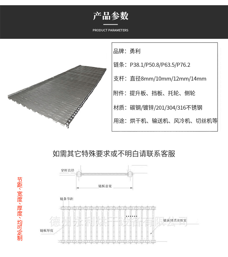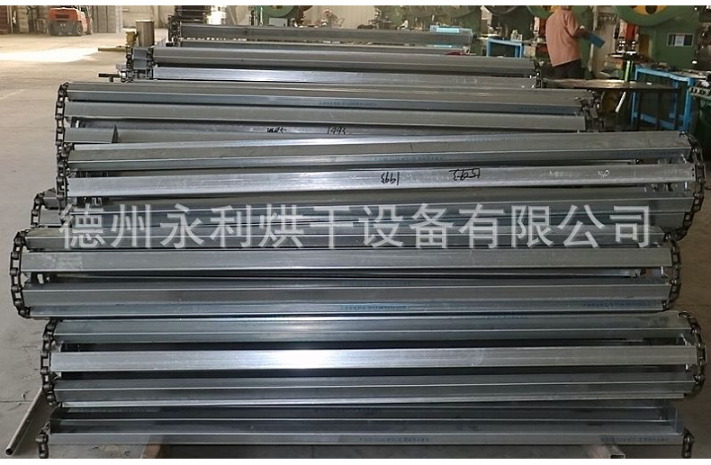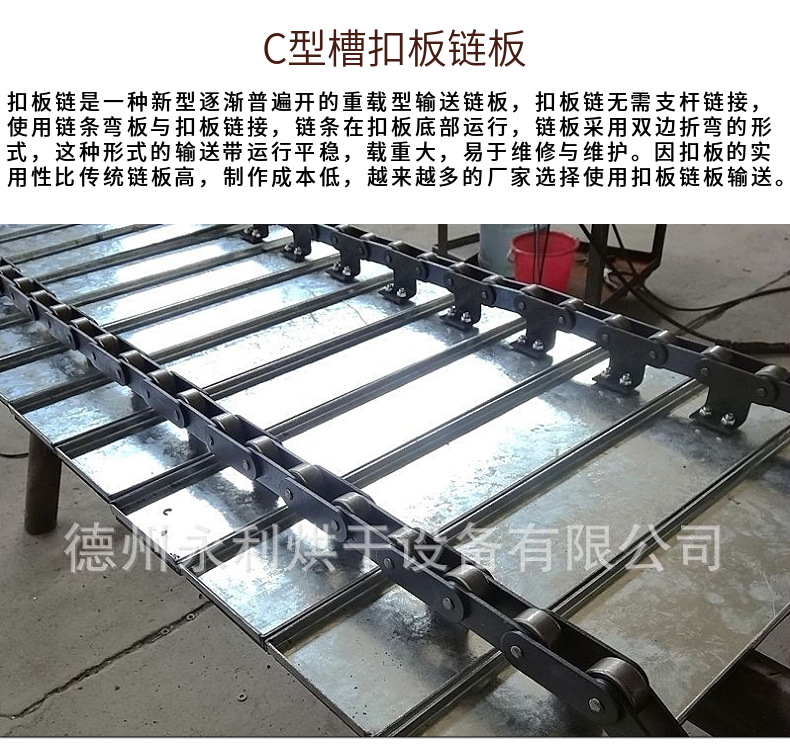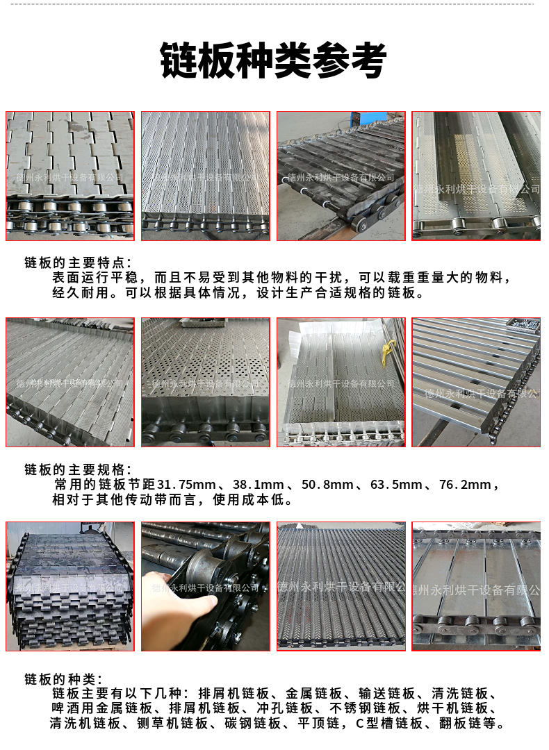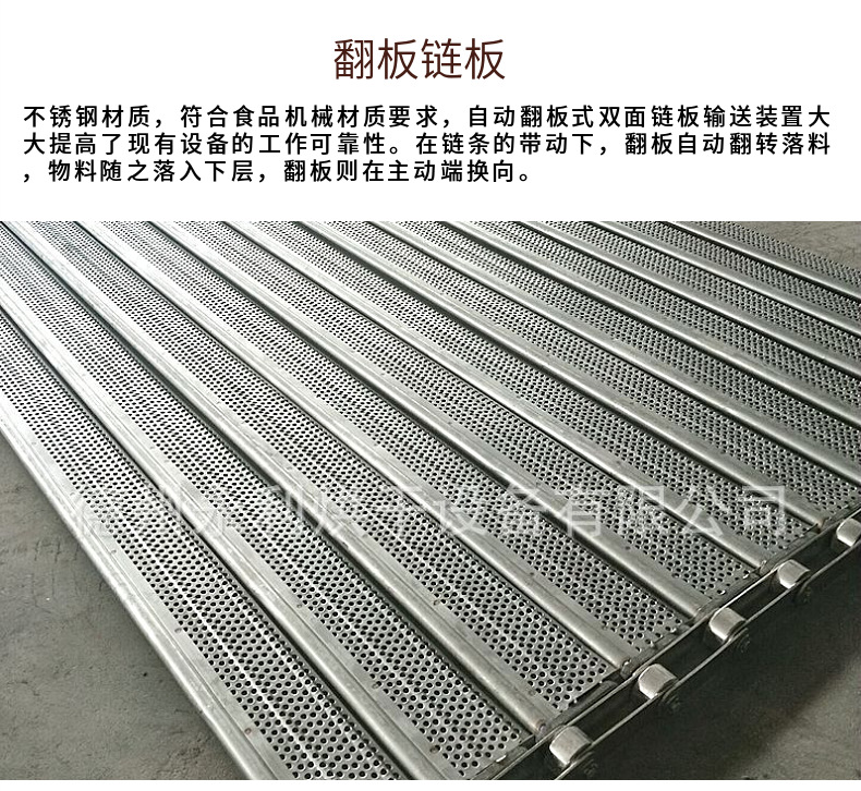重型链板输送带通过加厚链板、加粗支杆及链条节距来增加承重量,链板输送带加提升板及挡边使物料保证早输送带上运行。
