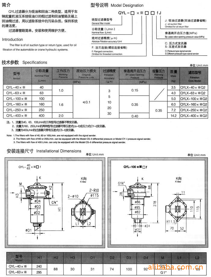 QYL过滤器分为吸油和回油二种类型,适用于车辆起重机液压系统吸油口的粗过滤和回油管路及箱上回油过滤,用以滤除系统中的污染杂质。保持系统的清洁度。