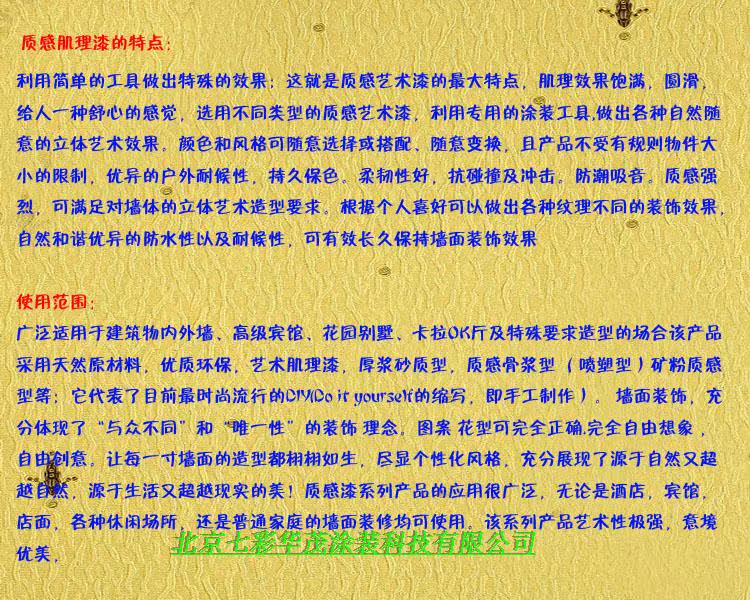选用多种类型的质感艺术涂料,利用专用的涂刷工具,做出各种自然随意的立体艺术效果。颜色和风格可随意选择或搭配,也可随意变更,且产品不受有规则物件大小的限制,优异的户外耐候性,持久保色。柔韧性好,抗碰撞及冲击。防潮吸音。质感强烈,可满足对墙体的立体艺术造型要求。根据个人喜好可以做出各种纹理不同的装饰效果,自然和谐,优异的防水性以及耐候性,可有效、长久保持墙面装饰效果。广泛适用于建筑物内外墙、高级宾馆、花园别墅、卡拉OK厅及特殊要求造型的场合。