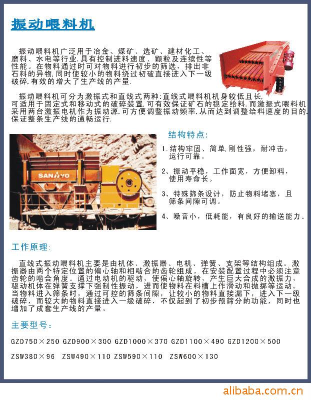 振动给料机主要是由机体、激振器、电机、弹簧、支架等组成。激振器有两个特定位置的偏心轴和齿轮。在安装配置过程中必须注意齿轮的吻合程度。通过电动机的驱动,使偏心轴旋转,产生巨大合成的激振力,驱动机体在弹簧支撑下强制性振动,进而使物料在料槽上作滑动和抛掷等运动。当物料进入栅栏时,通过可控的栅栏间隙,让较小的物料通过栅栏间隙漏下,直接进入下一级破碎,而较大的物料直接进入颚破。起到了初步预筛分的功能,同时也增加了破碎能力。