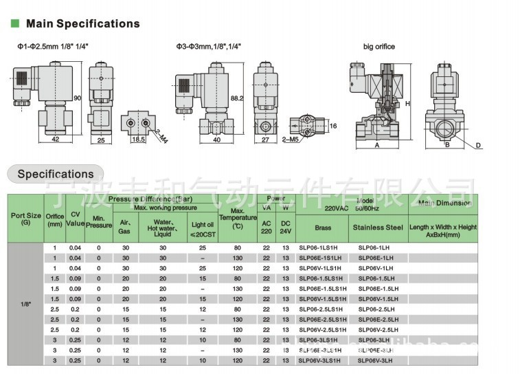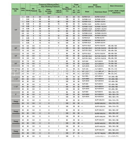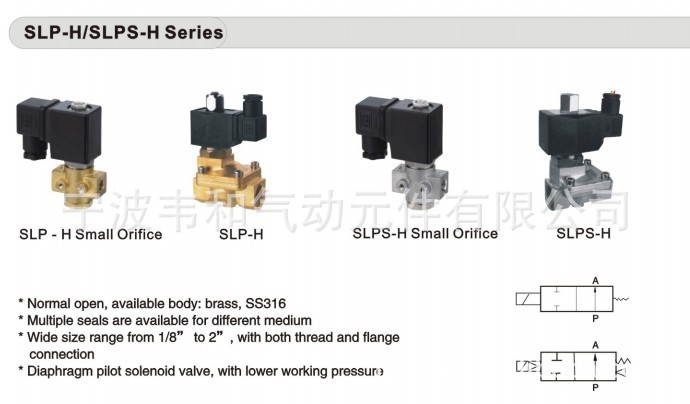 SLP系列二位二通常开型电磁阀。本产品有常开和常闭之分,阀体有铜和不绣钢316可供选择。接管口径从1/8"到2",也可以配法兰。产品为膜片先导式电磁阀,耐压偏低。