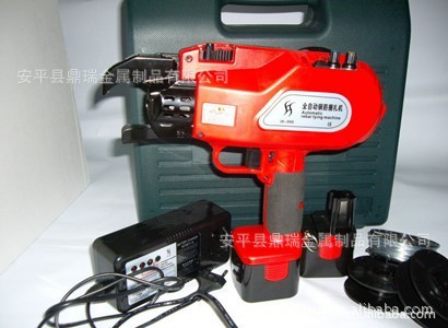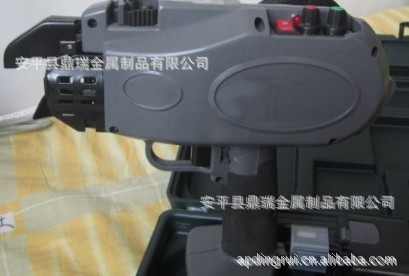 整机外型尺寸为277×100×290操作时重量为2.3Kg,钳口最大捆扎直径为39.5mm,线盘丝为0.8mm(正负0.02)的真空退火丝或镀锌丝,每盘丝长95左右米。每个结点需要69厘米的真空退火丝或镀锌丝,每盘丝可以打约120多个结点。马达电压为9.6伏,高质量3300mAh镍氢电池.电池满电后可打压约900个结点,其中0.8秒就可以打压一个结点,且充电时间为1个半小时.我们的产品噪音小,可用任何一种同类型号不规范的线盘,可以使用真空退火丝或镀锌丝两种丝.