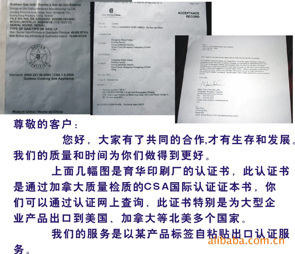 (CSA认证贴纸,CSA认证耐高温贴纸,CSA认证烧烤炉贴纸,CSA认证不干胶贴纸,CSA认证耐高温标签)以上几幅图是东莞市石排育华印刷厂的认证书,此认证书通过加拿大质量检质的CSA国际认证证书,你们可以通过认证网上查询,此证书特别是为大型企业产品出口到美国、加拿大等北美多个国家.
