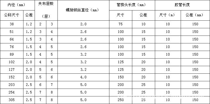 | | | | | 吸泥胶管性能指标 | 试验项目 | 内层胶国家标准 | 本厂标准 | 外层胶国家标准 | 本厂标准 | | 拉断强度 Mpa | >120 | >150 | >100 | >130 | | 拉断伸长率% | >400 | >500 | >400 | >500 | | 阿克隆磨耗平方厘米/1.6km | 1 | <0.8 | 1 | <0.8 | | 邵氏硬度 | | 60-66 | | 60-66 | | 使用温度 (度) | | -40~+60 | | -40~+60 | | 排泥胶管性能指标 | | 试验项目 | 内层胶国家标准 | 本厂标准 | 外层胶国家标准 | 本厂标准 | | 拉断强度 Mpa | >12 | >15 | >10 | >13 | | 拉断伸长率% | >400 | >500 | >400 | >500 | | 阿克隆磨耗平方厘米/1.6km | 1 | <0.8 | 1 | <0.8 | | 邵氏硬度 | | 60-66 | | 60-66 | | 使用温度 (度) | | -40~+60 | | -40~+60 |