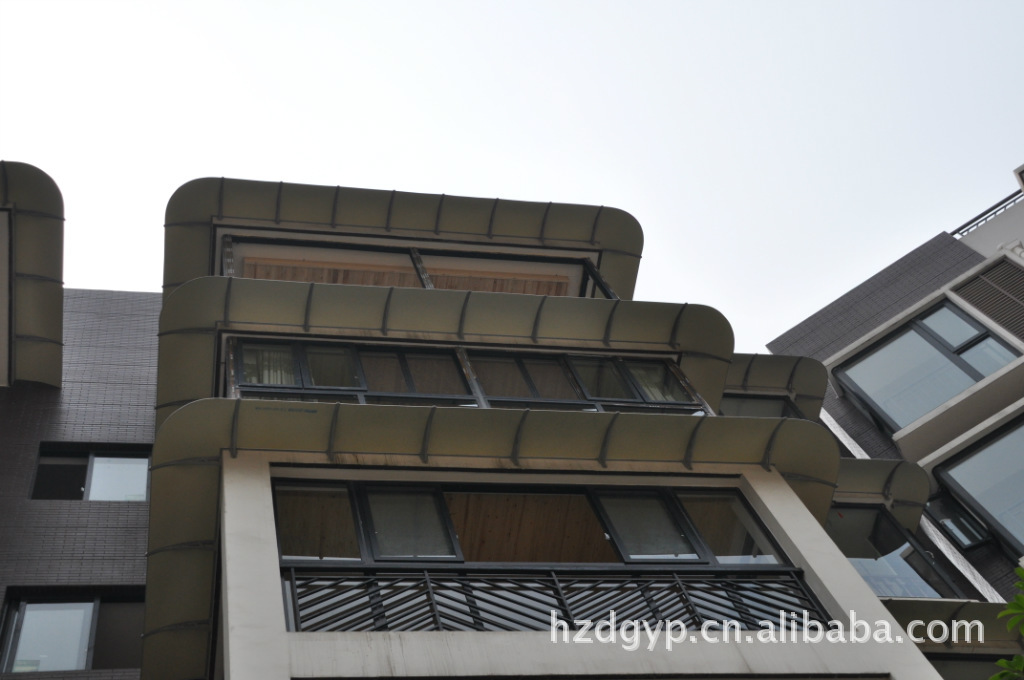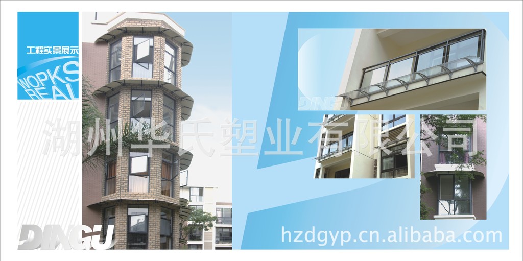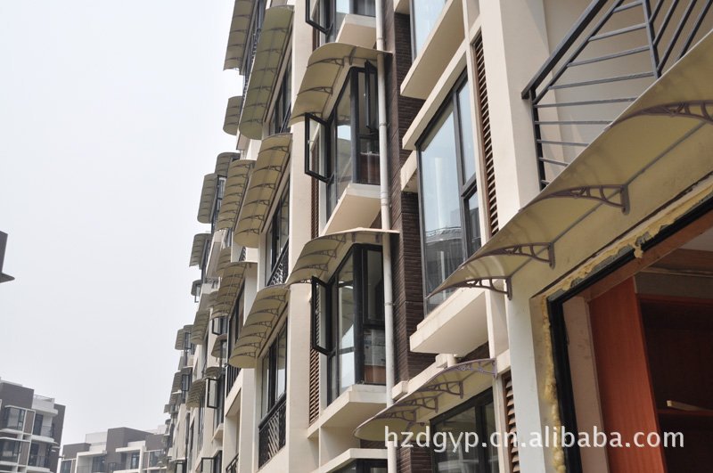 3、顶固雨篷采用进口高分子聚合板材、透光性好、透光度达到98%以上、能99%过滤紫外线,具有抗风、防腐、抗冲击、抗老化的特性。普通板材在低温下易碎,而顶固丽阳板在低温下反而更坚硬。加速老化实验结果是在恶劣天气情况下可以使用20年。