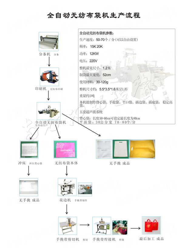 2008年6月1日起,为保护生态环境,中国开始限制塑料袋的使用。针对这一情况,东莞市南方力劲机械有限公司研发生产一系列超声波无纺布制袋设备,包括半自动生产机械、全自动生产机械,其中全自动无纺布制袋机理念先进,可生产不同规格、不同形状的无纺布袋,一体化操作,减少操作人员数量,大幅度提高生产效率,有效控制生产成本;所生产的无纺布牢固耐用,经济环保。改设备受到国内外用户的一致好评,已成为无纺布制袋企业和有志于从事无纺布制袋生产的人士的最佳选择。