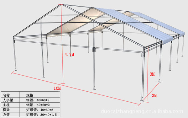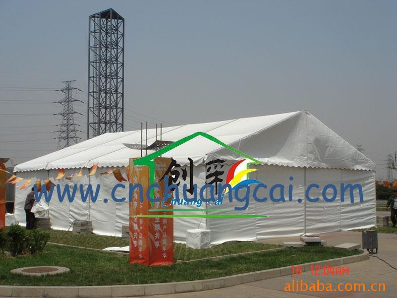 支架材料:可采用铝合金,表面静电喷涂.也可采用钢管,表面烤白漆.特 点:稳固安全、轻久耐用、装拆快捷、贮运方便、满足大面积需要.用 途:展览展销、庆典集会、露天宴会、抗险救灾、野外作业、体育娱乐、临时库房等.选购配件:挂帘布、带透明窗挂帘、PVC透明挂帘、带沙窗挂帘
