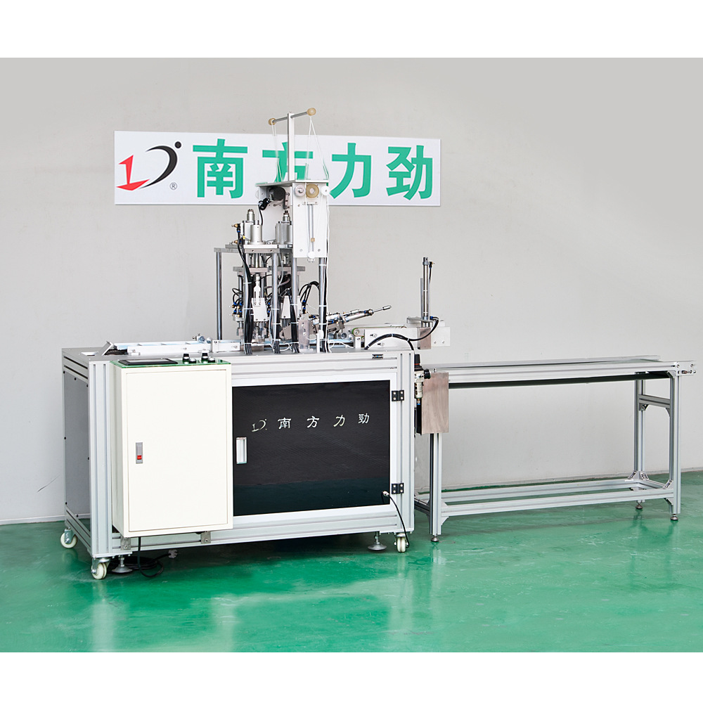 绑带式口罩机(NK-GW2016):南方力劲超声波口罩绑带机采用超声波焊接方式,于机台上设置输送装置,于输送装置输入口罩半成品,经过拉筒包边,再以超声波花轮压合后,将绑带切断,从而输出成品,只需一人將口罩本體置於機器的傳輸帶上,其余后续工作均全自动完成。
