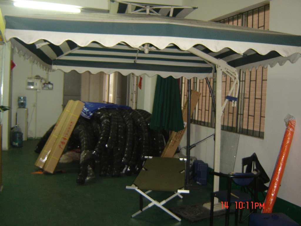 经过多年的开拓和发展,于2006年搬至佛山市顺德区勒流镇西华工业区自建厂房内,厂房面积6000多平方米,员工200多人。公司产品有:普通型、加强型、韩式易折合帐篷,车库帐篷&汽车太阳伞、侧臂遮阳伞、木伞&铝伞、组合式凉篷、铝合金组合式篷房、太空架式拼装篷房、亭院篷房、天幕式遮阳蓬、窗式遮阳篷、曲臂式遮阳篷等十一系列,200多个品种的户外遮阳用品。