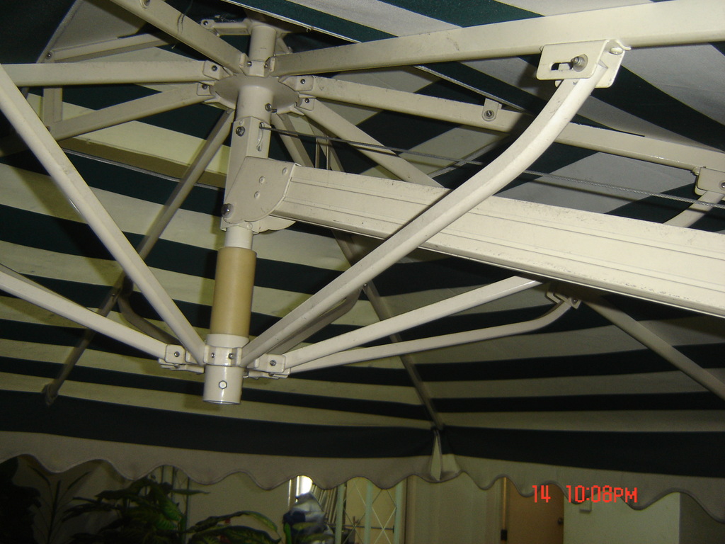 支架材料:铝合金支架,表面静电白色喷涂.伞中所用紧固件全部是不锈钢螺丝,底座采用大理石.