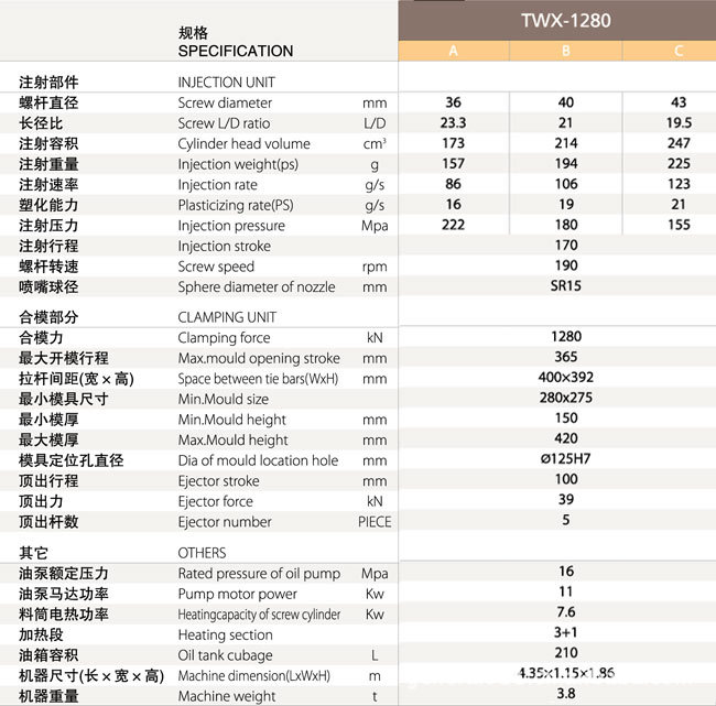 TWX系列注塑机是我公司在畅销多年的TW机型的基础上,经我司资深工程技术人员的潜心研究及不断的完善。对其锁模、注射以及整体机架等进行了有限元分析,机器的设计参数,整体性能,外观及结构都得到了全面的提升,是极富创造性设计的新机型。