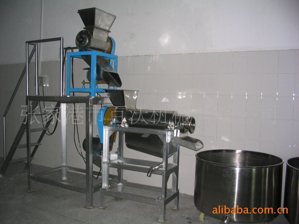 榨汁:主要构件是去核后的果肉、汁、皮通过斗进入螺旋榨汁机,由螺旋,螺旋沿着料渣出口方向底径逐渐加大而螺距逐渐减少,当物料被螺旋推进时,因螺旋腔体积缩小,形成对物料的压榨。螺旋主轴的转动方向从进料斗向渣槽方向看去,为顺时针方向。原料加入进料斗中,在螺旋的推进下受压,其压榨的汁液通过过滤网流入底部的盛汁器,而废料则通过螺旋及调压的锥形部分之间形成的环状空隙排出,调压头沿轴向的移动可调整空隙的大小。用于顺时针(从设备的出渣槽向进料斗端看转动手轮轴承座时,调压头向左,空隙即缩小、反之则空隙变大。)改变空隙的大小,即调整排渣的阻力,即可改变出渣率,但如果空隙过小,在强力挤压下,部分渣的颗粒会和汁一起通过过滤网被挤出,尽管出汁增加,但汁的质量相对下降,空隙的大小应视用户具体工艺要求而定。从而达到汁与渣自动分离的目的。