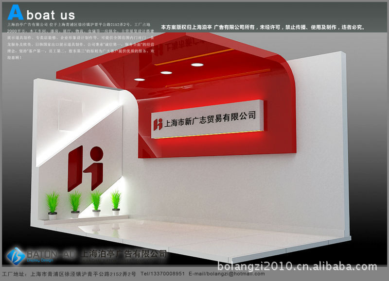 上海泊亭广告有限公司:位于上海市青浦区外青松公路7199号四区11幢甲,交通便利,近9号线佘山站,工厂占地2000平方,办公楼、木工车间、油漆车间、烤漆车间,道具加工产品主要有防火板、细木工板,中密度板,三聚氰胺板、亚光漆、高光漆系列。是一家集设计、生产、为一体的专业商场道具,商场专柜,专卖店装修,展览展示道具设计制作公司,更是中国最专业的展示道具生产厂家之一。公司具有高水平专业的三维设计人员和技术超强的施工队伍,是从事商场设施、专卖店室内陈列及大型展览展示的专业化公司,在展览展示方面具有丰富的经验。所有产品都根据客户的兴趣爱好和实际使用需求设计订做。并进行商场及店面的整体展柜的设计布置制作。所有产品均在后场一次性制作完成,无装修污染,绿色环保。