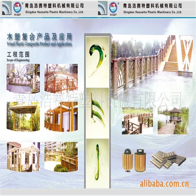 本生产线是将塑料与废弃木质纤维按一定比例添加塑料、加工助剂制成的木塑复合材料,并经高温、高压挤出的结构型材,由于公司参照了国外最新技术,对机组进行了优化设计,使其具有塑化均匀、剪切速率小、产量高、使用寿命长等优点。本生产线广泛用应于托盘生产、箱板包装、地板与门窗框架装饰等领域。