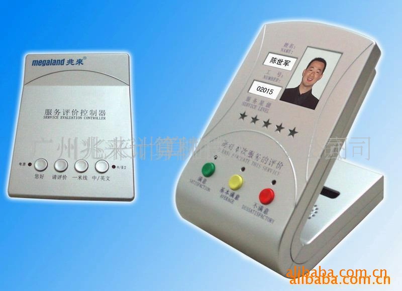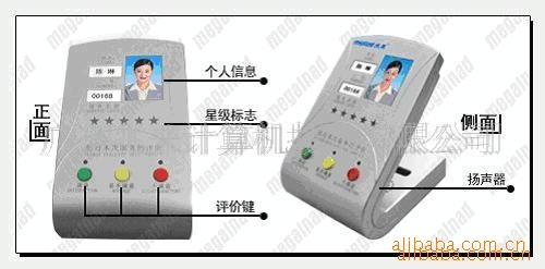 功能简介:◆柜员上岗时将自己的IC卡插入L型机,提示“您好,欢迎光临”,的欢迎语音,当办理业务将结束时,柜员按动柜台内的“评价”键后自动语音提示:“请您对我的工作给予评价”; 当顾客按动评价键后,评价操作器自动语音提示:“谢谢”。音量可手动调节◆只有当“评价”键被触动20秒内(可调),评价信息方可有效录入,避免顾客意见重复统计。可设置实现一窗多位柜员(工作人员) 共用一台评价控制器,大大降低使用成本。◆供顾客评价的功能有“满意、基本满意、不满意”三种评价按键◆L型机上可插入(灵活装卸)含员工照片、工号、姓名的IC卡◆L型机通过星级指示灯可显示当前员工的星级(每个星级亮一盏指示灯,分1-5几个级别)◆可以串联50台,采用一个COM口,员工工号128个◆支持员工身份识别,可有效识别被评价员工的身份,评价结果具体到人,以确保员工在调整窗口或岗位时评价信息的连续性、唯一性,不至于出现错评、误评现象◆每个评价器都配有一个性能稳定的高级开关电源◆集成语音提示一米线功能及语音中/英文切换功能◆可选择采用USB接口传输,只需其中一台评价器采用USB连接,其它采用串行连接,也可以一台评价器对应一台电脑◆也可选择采用无线收发,无需长距离布线,安装、移位方便,不影响大厅现有环境;且省去布线烦恼