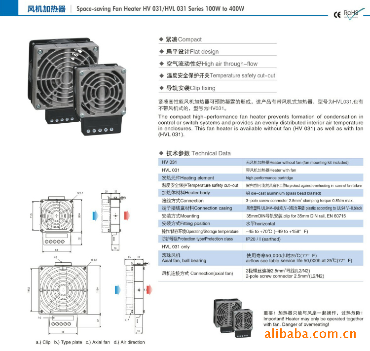 订货代号Art. No. HV 031 230VAC,50/60Hz | 订货代号Art. No. HV 031 120VAC,50/60Hz | 功率 Heating capacity | 尺寸 Dimensions | 重量 Weight(approw.) |