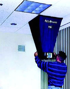 TSI公司的ACCUBALANCE套帽式风量罩可测定流经各种风口(散流器、百叶等)的风量。体积轻巧,仅重3.5Kg,便于携带使用。把风量罩安放在风口上,就可由数字显示屏直接读出进风或排风量。8373型号还可以精确的测定温度。