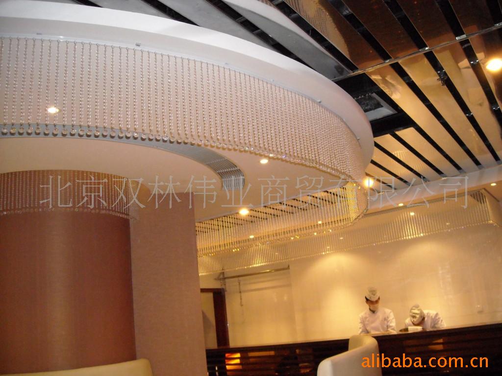 水晶珠帘作为顶面装饰,主要利用的是它的多个棱面来反射光线的性能,所以用水晶珠帘做吊顶时也一定要使用灯光来配合,能够营造出一种迷幻与浪漫感觉。