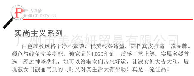 描述:啡色底纹风格干净不繁琐,优美线条造型,高档真皮打造一流品牌。颜色与线条完美搭配,独家品牌LOGO印证,质感工艺上等。实属名媛首选!