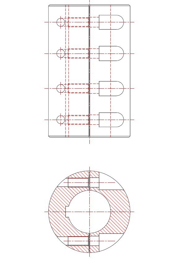 夹壳联轴器装配和拆卸时轴不需轴向移动,所以装拆很方便,缺点是两轴轴线对中精度低,结构和形状比较复杂,制造及平衡精度较低,只适用于低速和载荷平稳的场合,通常最大外缘的线速度不大于 5m/s ,当线速度超过 5m/s 时需要进行平衡校验。