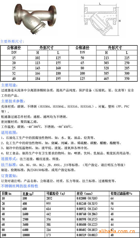 Y型过滤器是输送介质的管道系统不可缺少的一种过滤装置,Y型过滤器通常安装在减压阀、泄压阀、定水位阀或其它设备的进口端,用来清除介质中的杂质,以保护阀门及设备的正常使用。Y型过滤器具有结构先进,阻力小,排污方便等特点。Y型过滤器适用介质可为水、油、气。一般通水网为18~30目,通气网为10~100目,通油网为100~480目。 篮式过滤器主要由接管、主管、滤蓝、法兰、法兰盖及紧固件等组成。当液体通过主管进入滤蓝后,固体杂质颗粒被阻挡在滤蓝内,而洁净的流体通过滤蓝、由过滤器出口排出。