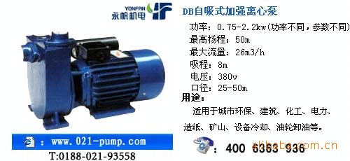 DB自吸式离心泵,它具有结构紧凑、操作方便、维修方便、效率高、寿命长、并有较强的自吸能力等优点。管路中不需要安装底阀,工作前只需要保留泵体内储有定量引液即可,因此简化了管路系统,改善了劳动条件。