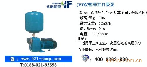 JET系列喷射泵结合了离心泵与自吸泵的功能与优点,产品经优化设计,具有自吸时间短、性能可靠、结构紧凑、高扬程、效率高等优点,适用于输送清水、液体温度<45℃,广泛用于工矿企业、高层住宅的高层供水、农业灌溉、水处理等方面。