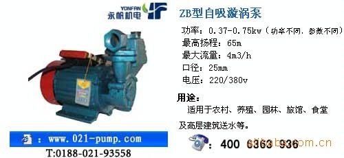 ZB型自吸旋涡泵由电机、水泵、密封三部分组成。电机为单相异步电机,泵部分为旋涡式叶轮结构,具有自吸功能;水泵与电机之间采用单端面机械密封。用于河水、井水、自来水加压等给排水之用,如农村、养殖、园林、旅馆、食堂及高层建筑送水等,输送水源条件为清水。