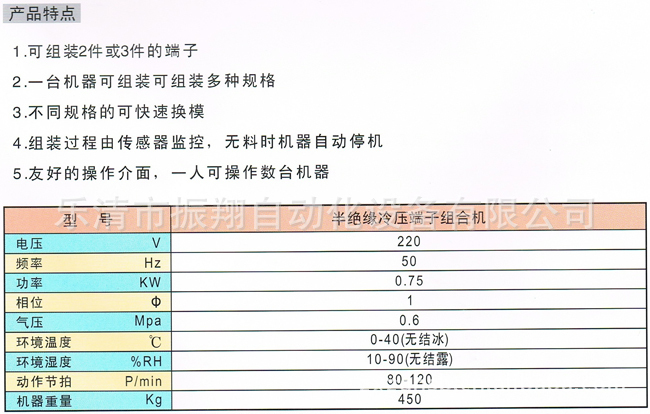 乐清市振翔自动化设备有限公司是一家集设计,开发,生产,销售和服务体的自动化设备生产企业。公司创建于2004年,近年来,公司在广大客户的热心支持下,规模不断扩大,现拥有员工30多人,其中技术员有20多人。拥有多年从事自动化设备设计,开发,制造的经验。客户遍及全国,乃至世界,公司产品曾多次出口到欧洲(土耳其),中东(伊拉克,伊朗)等国。产品主要有:钢钉线卡组合机,接线柱拧(退)螺丝机,不锈钢扎带自动冲压机, 端子焊接机, 压线帽组合机 ,接线柱丝功机,电缆防水接头组合机, 端子焊接机, 振动盘等,同时可根据客户要求,设计开发自动化非标设备。广泛用于电子,电器,五金,塑胶,文具,玩具,医疗,食品等行业。公司本着“追求品质,永无止境”的企业方针,把“提高产品合格率,提升客户满意度”为动力,在创新中求发展。始终本着“质量第一,顾客至上”的原则,以“创新、求实、诚信、拓展”为企业精神,以“诚信为本”的经营理念服务客户,赢得了广大客户的支持。秉承追求服务理念。从设计出发,生产制造到售后服务,以专业的技术、一流质量、人来函考察,洽谈业务! 服务于各行业。我们真诚期望与您携手共进,共创辉煌!欢迎来人考察洽谈业务!