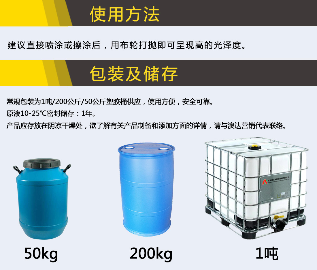 本品为水性环保阴离子型,采用新型的乳化技术以进口巴西棕榈蜡为主要原料生产的技术含量高的产品,其水溶性强、乳液稳定,表面无结孔,底无沉淀,可任意比例水稀释不分层、不破乳。使用本品后可赋予皮面高的光泽度及光亮度。
