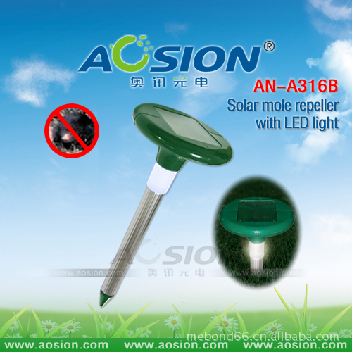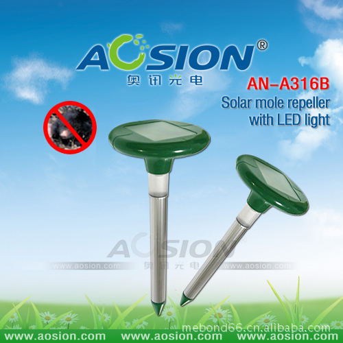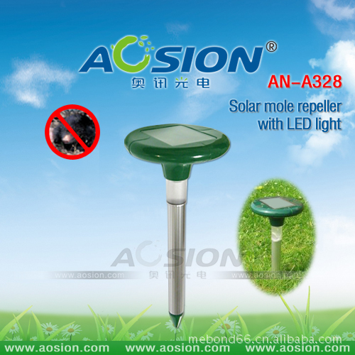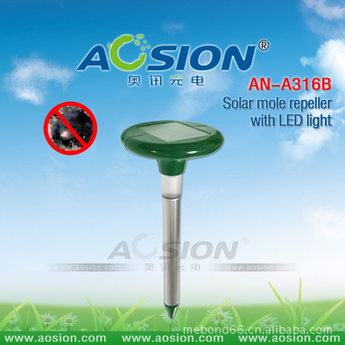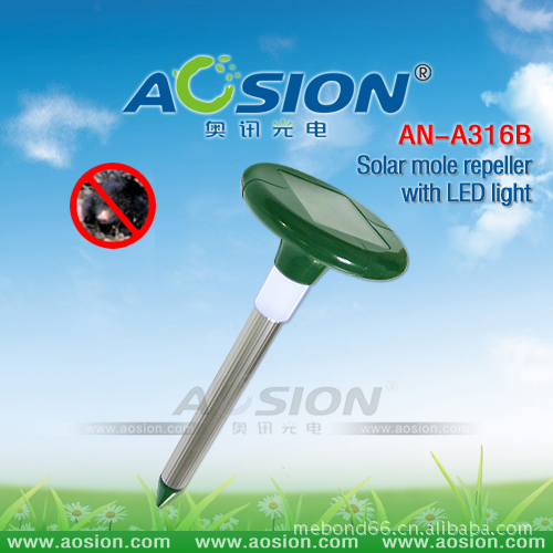太阳能带灯驱鼠器(专利产品:ZL 2009 3 0168653.0) 太阳能板功率:4V/45MA 太阳能板尺寸:70×90MM 充电电池:1×1.2V/800mAH "AA" Ni-Cd 或者Ni-MH 充电电流:环境光度90000LUX的充电电流≥45MA 材 料: ABS & 铝管 产品总高度: 384mm 铝管直径: ∮28.78 安装方式: 地面安装 产品优点: 1.利用模拟刺激老鼠中枢神经的声波及振动波在地下发射传播,引起老鼠的不适感及恐慌不安,使其不愿接近现场。 2.适用于户外花园、苗圃、草坪等地面及地下驱鼠。 3.动力源为太阳能,省电免维护,为绿色环保产品。在太阳下暴晒一天可供4个阴雨天工作 4.特有加UV料,防紫外线,使用1-2年不会褪色 5.适用范围:625平方米 6.LED灯有自动识别系统,当感应到光线很弱的时候会自动开启,持续工作4个小时,点亮您的花园的同时也可以达到驱鼠的功效。 包装资料: Box size: 31.5x15.5x9.5CM QTY: 10 PCS N.W: 5 KGS G.W: 6 KGS MEAS:49x32.5x32.5CM 包装︰ 彩盒 认证︰ CE&ROHS
