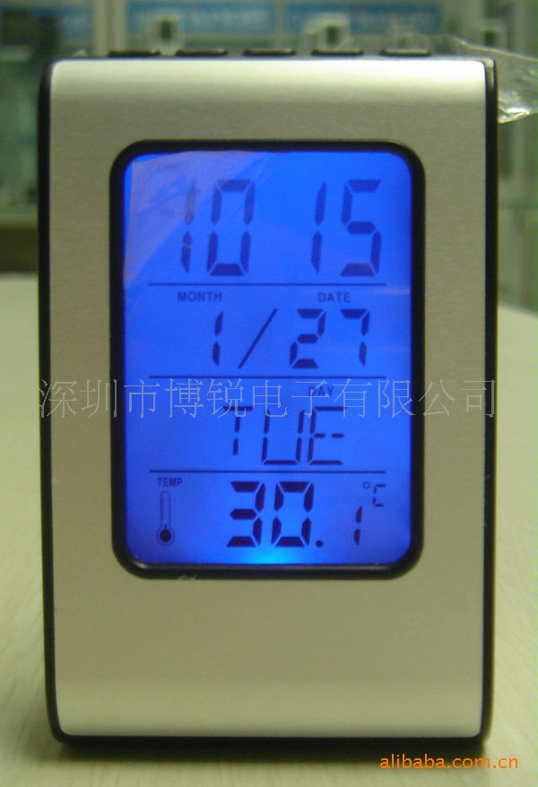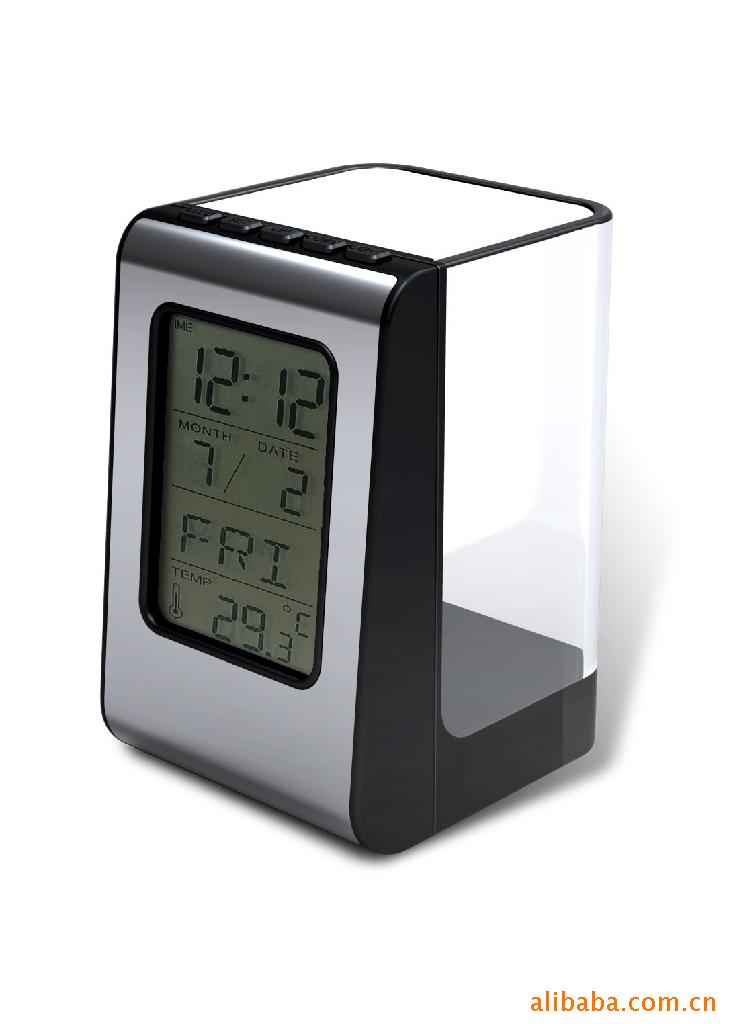 功能:笔筒、兰色背光灯、万年历、音乐闹铃、贪睡、温度、计时器。