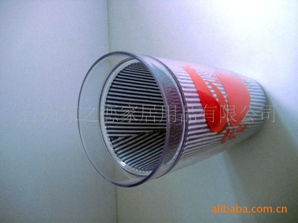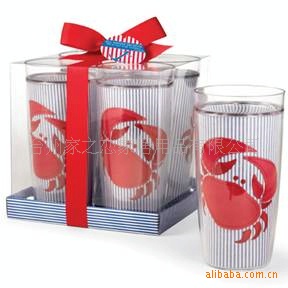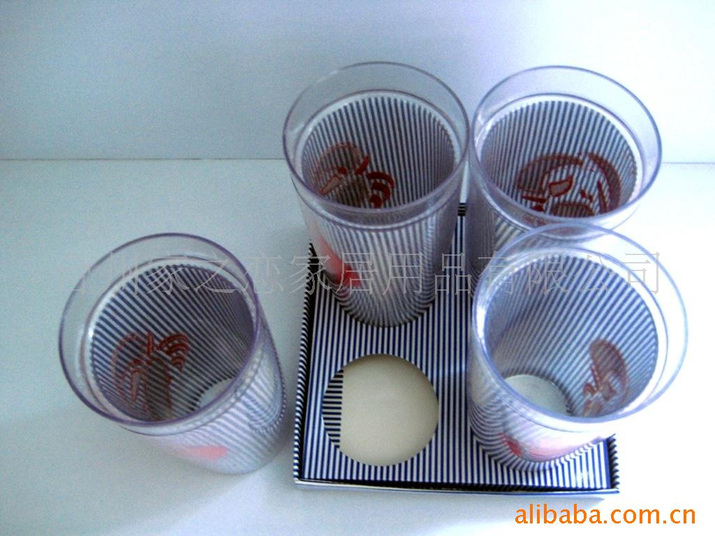 产品采用透明、纯净PS为原料的双层中空壳体,经注塑成型后,可植入广告(彩纸、皮革、布料等),也可以在杯体表面或夹层里面印刷广告。四个杯入一透明PVC盒.底部有彩盒印刷的杯托,再用红色缎料蝴蝶结捆扎。
