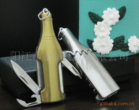 此款为酒瓶形装开瓶器,代表着酒的意思。造型美观时尚,立体的鱼形感,每缝佳节用来送礼或者家庭用业开红酒,配件分为小刀、开瓶器、丝子、指甲锉、匙圈。简单实用,是较好酒类的促销礼品,同时也可以接受客人的来样订做,欢迎询问. 也可以印客人LOGO或者激光