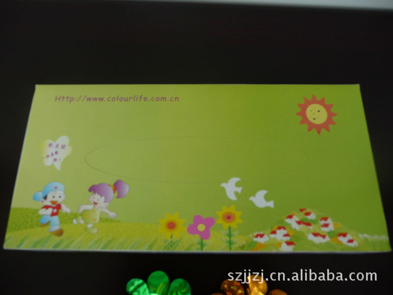 盒装纸 纸盒材质:350g灰卡纸,可过油磨光,22*11*6cm;纸巾材质:100%进口原木浆纸,18*20或20*20cm/张,80-150抽/盒,80盒/箱;起订量5000盒起;价格:1.58元起,量多价格可另算。